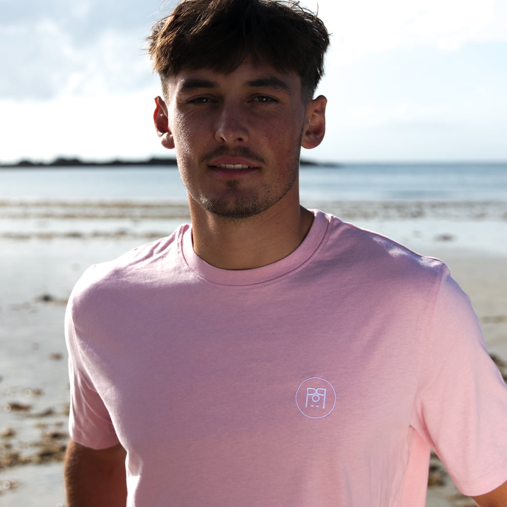 • Broderie sur la poitrine gauche couleurs framboise, réalisée en France